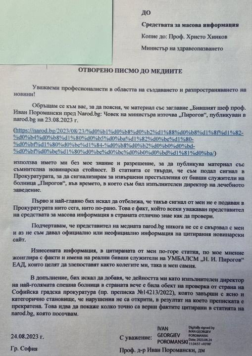 4. Пред народните представители в КЗ на НС твърдеше, че прокуратурата води разследване в Пирогов, но срещу служители на МЗ, които преди 2 години са работили в Пирогов като заместници на проф. Балтов, като настояваше, че това се е случило по сигнал на проф. Поромански. Оказа се, че и това не е вярно – прилагам Отвореното писмо на проф. Поромански до медиите и до МЗ, в което той отрича изцяло твърденията на народния представител Васил Пандов и директора Валентин Димитров, които са били анонимно и удобно публикувани в Народ.бг още през м. август, но преди това изричани многократно от двамата цитирани. Нещо повече – СГП е направила проверка и нарушения не са били открити, а преписката е била прекратена. Тук имаме и злоупотреба с името и личността на проф. Поромански – медийна и институционална. Имаме и набеждаване на длъжностни лица;