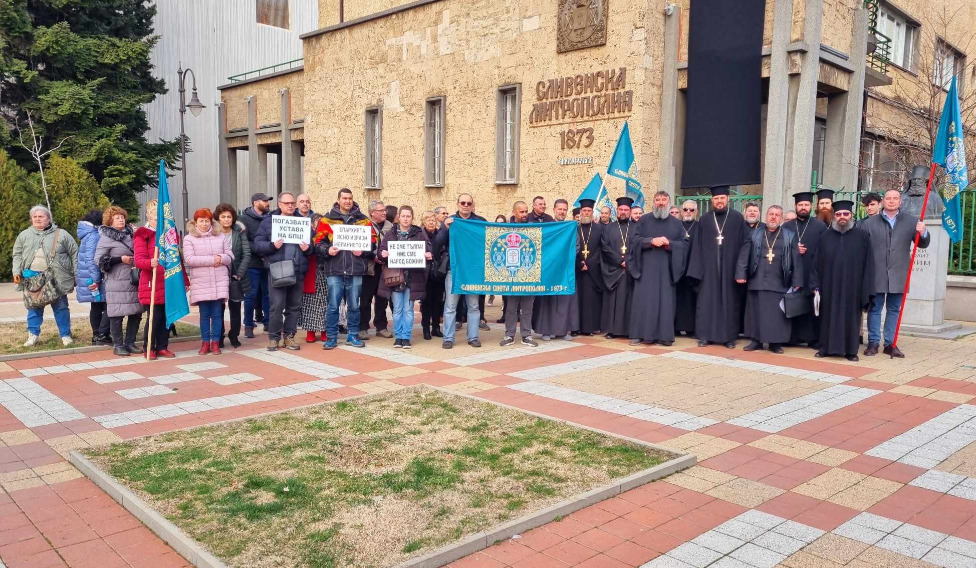 На 26 февруари духовници и миряни излязоха в знак на протест пред Сливенска митрополия. Стартираха подписки в град Поморие, град Ахтопол и онлайн петиция в подкрепа на епископ Иеротей и изборите за Сливенски митрополит от 18 февруари. Богословът и предподавател по църковно право в Софийския университет прод. д-р Дилян Николчев веднага направи коментар по темата в профила си във Фейсбук, като посочи, че "Свeтият Синод манипулативно изопачава съдържанието и смисъла на цитираните в предложението църковни правила". Междувременно се говори, че зад скандала в БПЦ прозира сянката на Пловдивския митрополит Николай (известен в публичното пространство с прякора "Ники Ролекса" и протекциите от властимащи), на когото му били нужни угодни верни или зависими пажи, които да послужат за обслужване на крайната му цел - заемане на патриаршеския престол. Фаворитът на Николай Пловдивски бил Знеполския епископ Арсений /тук/, който обаче не успява да се класира на второ място на изборите от 18 февруари. Предвид влошеното здравословно състояние на Българския патриарх Неофит, не е изключено до края на годината да се стигне до избори за нов Патриарх на Българската православна църква, гласът на всеки митрополит за избора е от голямо значение, но явно епископ Иеротей не се вписва в задкулисните схеми. /виж тук/