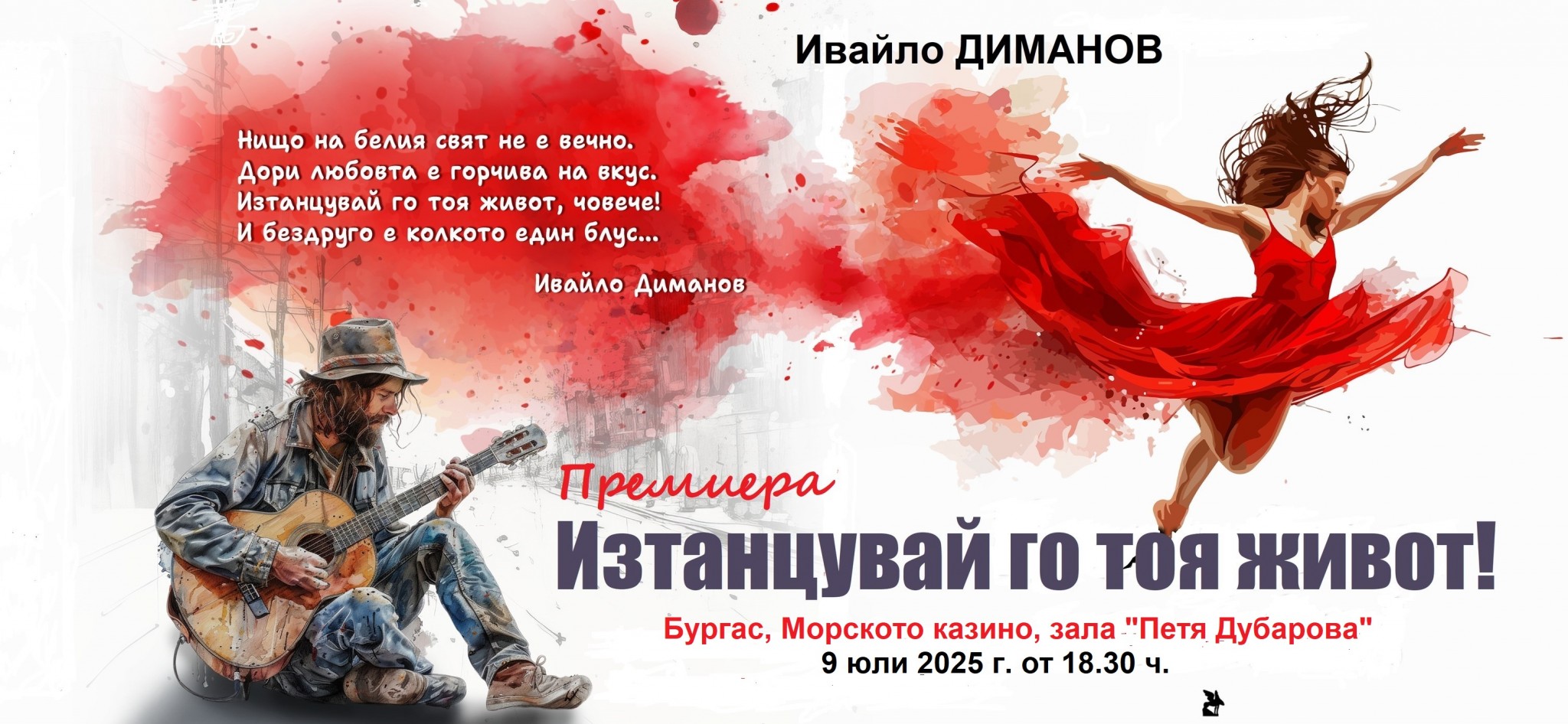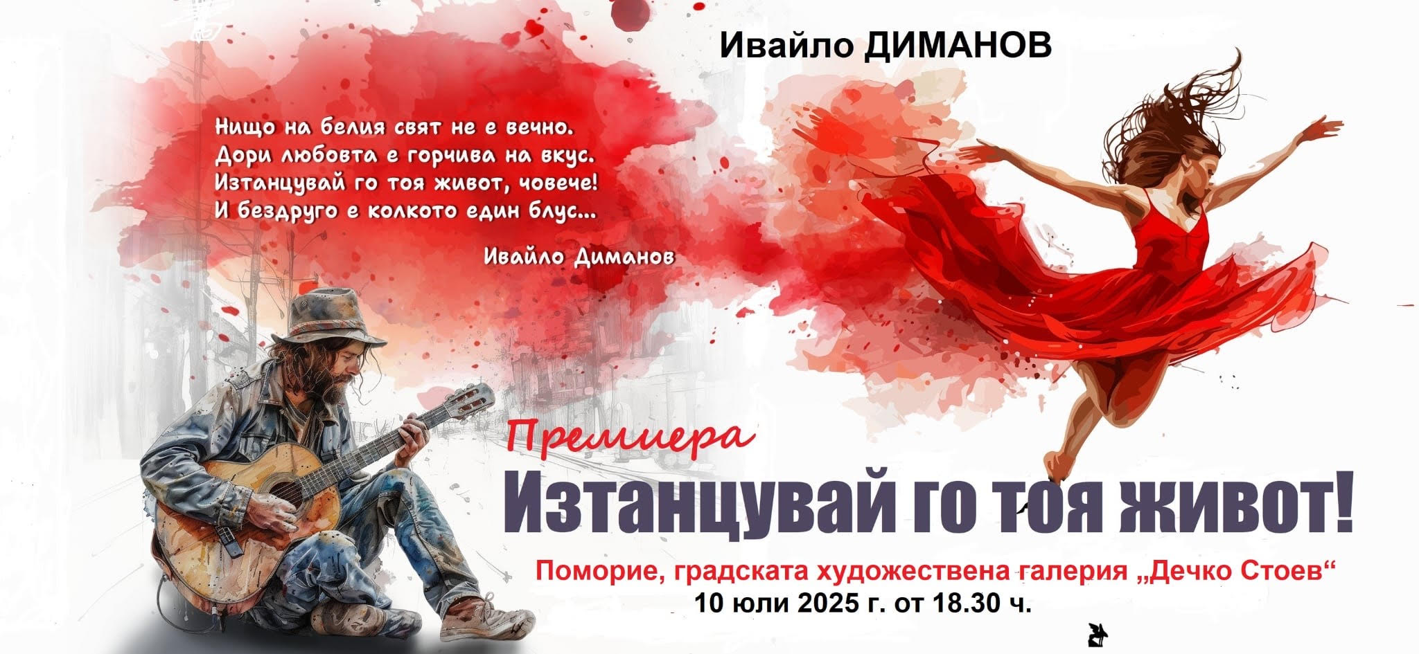 На 9 юли от 18:30 ч. в Бургас и на 10 юли от 18:30 ч. в Поморие поетът, бард и журналист Ивайло Диманов ще представи най-новата си стихосбирка "Изтанцувай го тоя живот". В Бъргас културнотто събитие ще се състои в Морско казино, зала "Петя Дубарова", а в Поморие - Градска художествена галерия "Дечко Стоев".